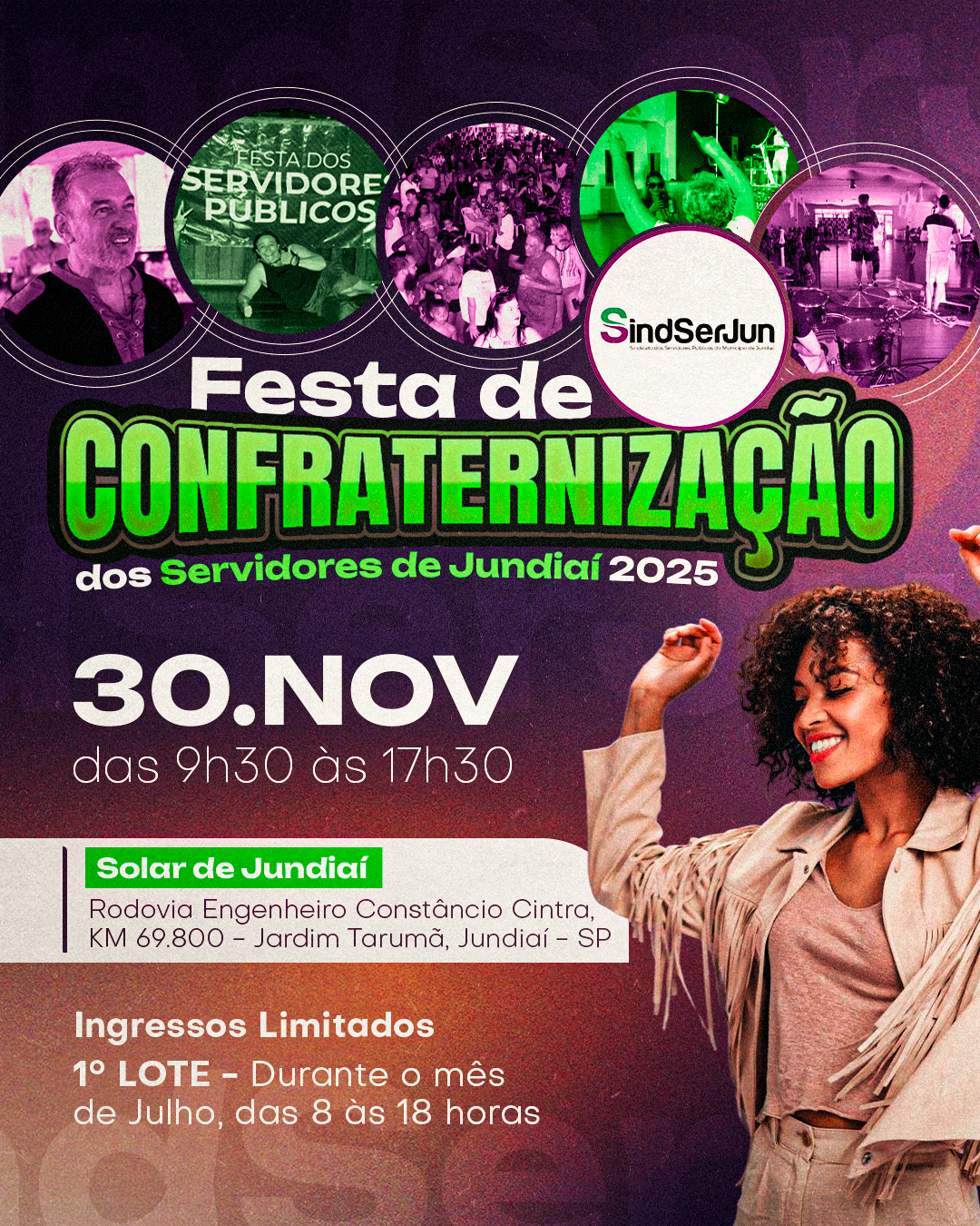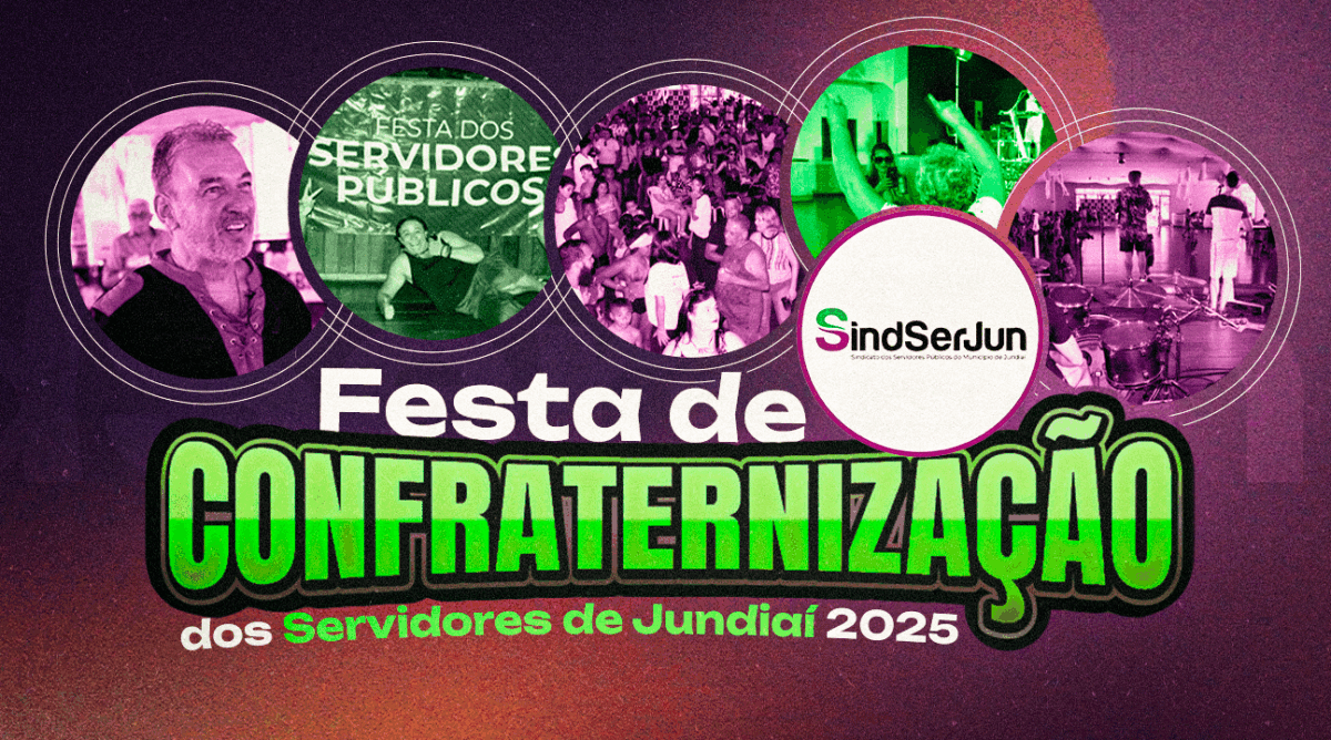 Já passamos da metade do ano e o SINDSERJUN vem com tudo para a tão esperada Confraternização dos Servidores 2025! Por isso, já se programe: dia 30 de novembro, das 9h30 às 17h30, no Solar de Jundiaí (Rodovia Engenheiro Constâncio Cintra, KM 69.800, Jardim Tarumã, Jundiaí/SP). Os Servidores já podem adquirir seus ingressos (PRIMEIRO LOTE) na sede do Sindicato. Os preços dos convites serão diferentes em cada lote. Quanto antes você garantir o seu, MELHOR!