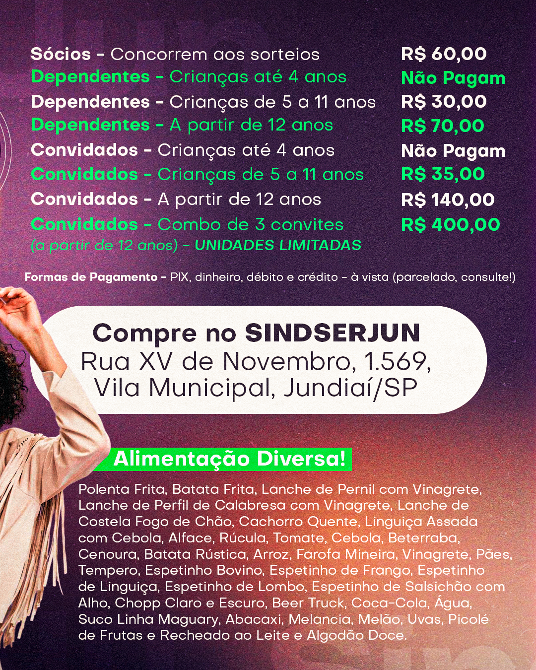 Venda dos convites – Sede do SINDSERJUN (rua XV de Novembro, 1.569, Vila Municipal, Jundiaí/SP), das 8 às 18 horas.