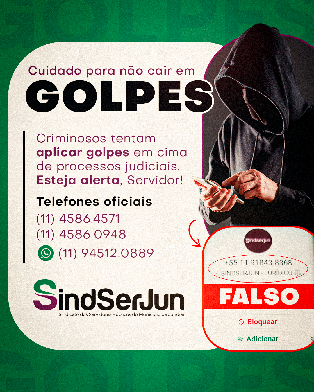 O SINDSERJUN novamente alerta a categoria sobre golpes em nome da entidade. Criminosos estão se passando pelo nosso Jurídico e enviando mensagens referentes a um SUPOSTO “alvará de liberação do precatório”. Não acredite, Servidor!