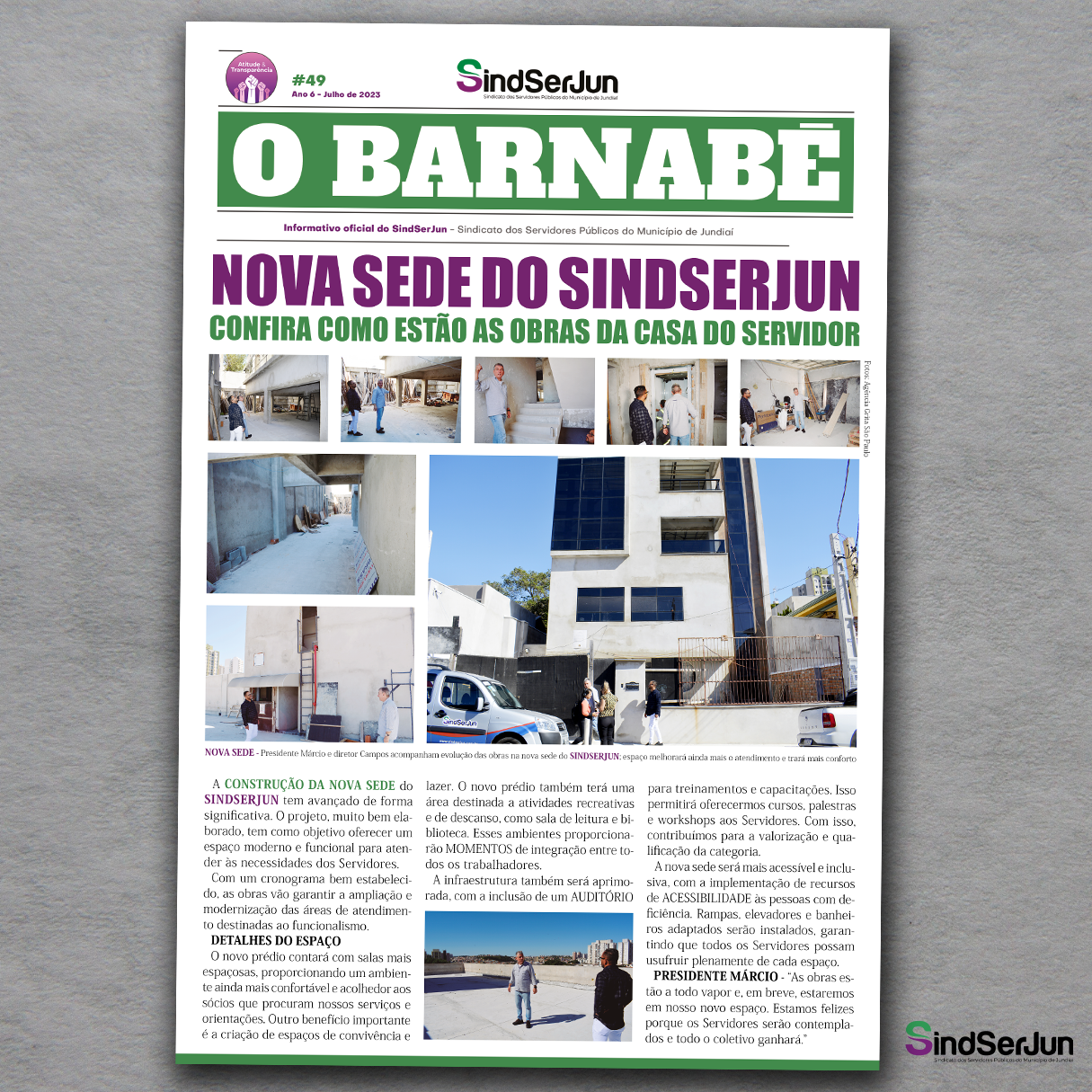 O jornal do SINDSERJUN, “O Barnabé”, começou a circular no dia 10 de julho. A edição nº 49 – julho, em cor, quatro páginas, traz as principais ações do Sindicato em prol do coletivo dos Servidores de Jundiaí. Na manchete, destacamos os avanços na construção da nova sede do Sindicato – a “Casa do Servidor”. O espaço está com as obras bem avançadas e, em breve, vai garantir maior conforto a todos associados da entidade.