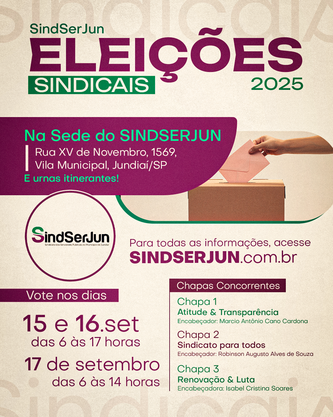 ELEIÇÕES SINDICAIS | Confira as chapas inscritas para concorrer na escolha da nova diretoria do SINDSERJUN