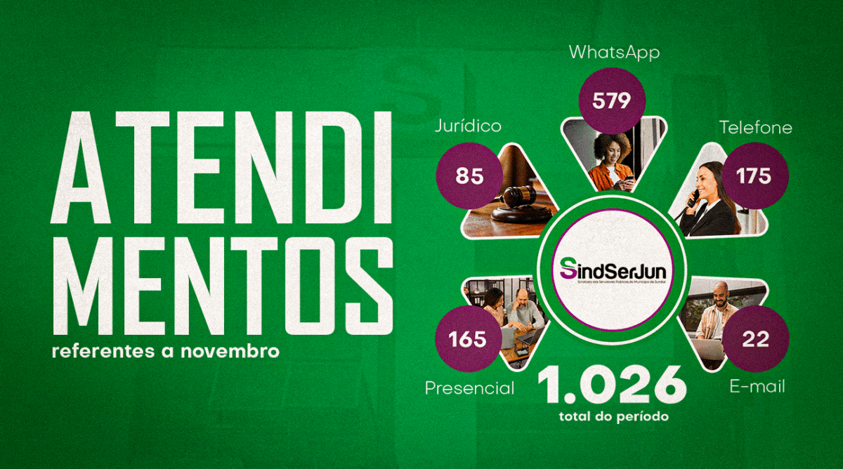 O mês de novembro foi de movimento intenso no SINDSERJUN. O sindicato se destacou pelo trabalho incansável em prol dos Servidores municipais de Jundiaí, com um volume expressivo de suportes prestados. Somente a equipe da recepção realizou 941 atendimentos, enquanto o Departamento Jurídico garantiu suporte especializado para 85 funcionários em questões trabalhistas. Na soma, foram 1.026 serviços prestados, um número que reflete a atuação constante e dedicada da entidade na defesa individual e coletiva dos direitos.
