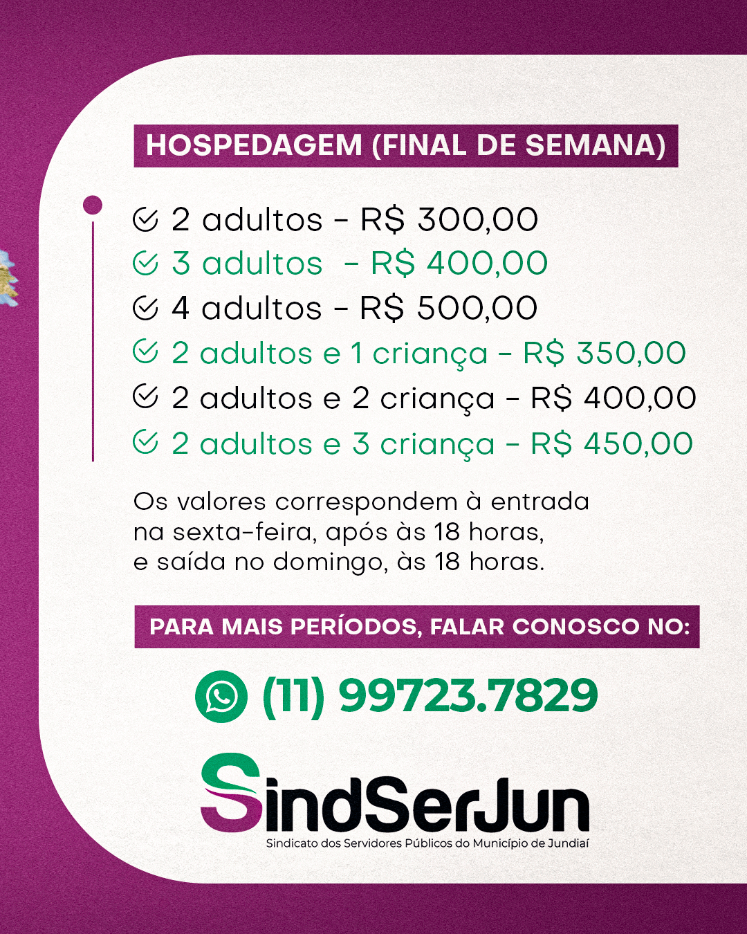 Vale destacar que os valores correspondem à entrada na sexta-feira, após às 18 horas, e saída no domingo, às 18 horas. Também é possível negociar outros períodos e a quantidade de pessoas, para isso basta entrar em contato pelo WhatsApp (11) 99723.7829. Associados do Sindicato já têm direito a 10% de desconto.