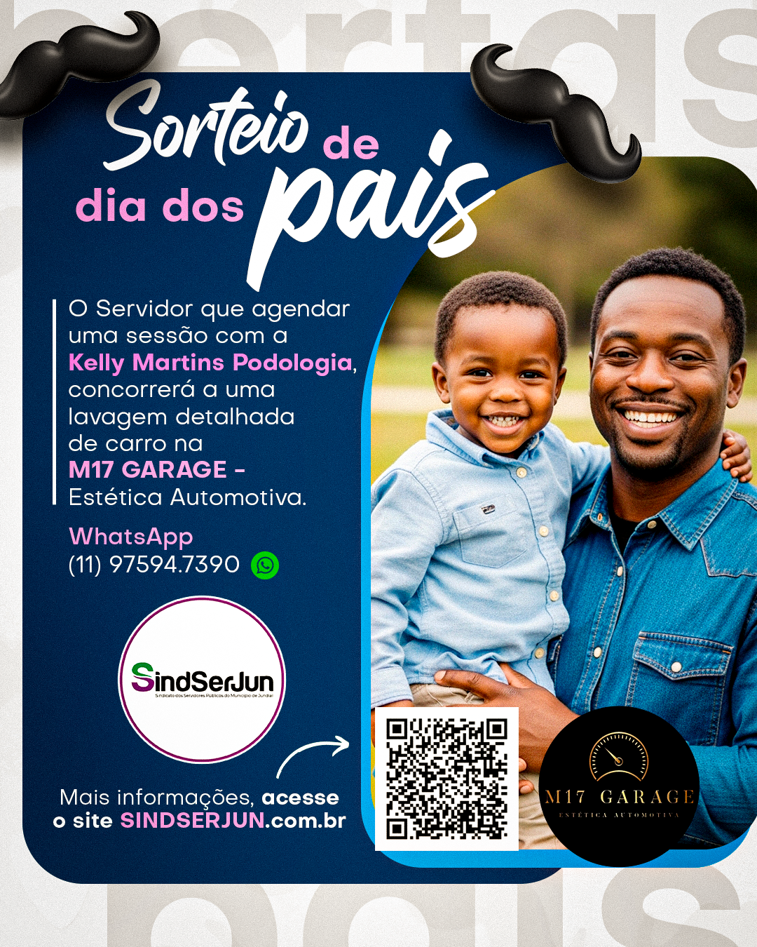 Duas parcerias do SINDSERJUN prepararam uma ação especial para celebrar o Dia dos Pais! O Servidor que agendar uma sessão com a Kelly Martins Podologia estará automaticamente concorrendo a uma lavagem detalhada do carro na M17 GARAGE – Estética Automotiva. E o melhor: o serviço será realizado no conforto da sua casa! Para mais informações e para agendar sua sessão, entre em contato pelo WhatsApp (11) 97594.7390.