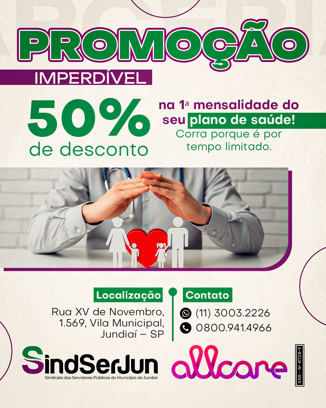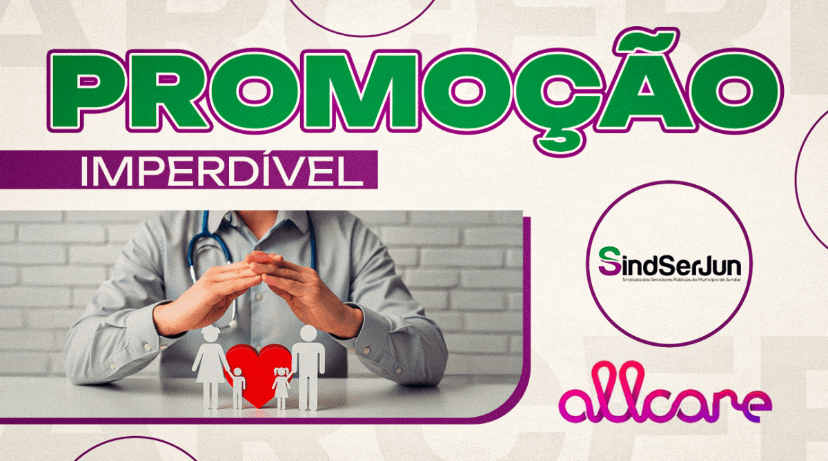 O SINDSERJUN, em parceria com a Allcare, oferece uma condição exclusiva para novas adesões aos planos de saúde oferecidos pelo Sindicato. A promoção é simplesmente imperdível: 50% de desconto na primeira mensalidade do convênio contratado. A promoção é válida por tempo limitado e é oportunidade perfeita para os sócios garantirem proteção e qualidade de vida com um dos maiores grupos de assistência à saúde do País.