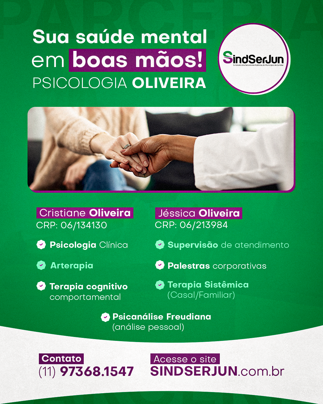 A parceria do SINDSERJUN com a Psicologia Oliveira disponibiliza aos Servidores associados uma ampla gama de atendimentos na área da saúde mental. As Dras. Cristiane Oliveira (CRP: 06/134130) e Jéssica Oliveira (CRP: 06/213984) oferecem serviços de Psicologia Clínica, Supervisão de Atendimento, Arteterapia, Terapia Cognitivo-Comportamental, Terapia Sistêmica (Casal e Familiar), Psicanálise Freudiana (análise pessoal), além de palestras.