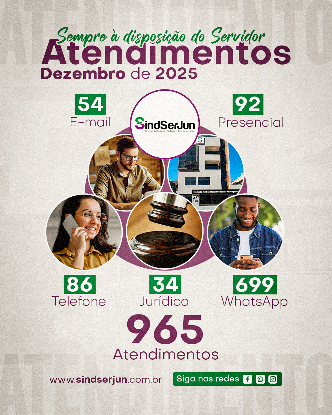 A diretoria e a equipe do SINDSERJUN, sob a liderança do presidente Márcio Cardona, desempenharam um papel fundamental para alcançar esses resultados expressivos. Importante destacar que no último mês do ano também mantivemos uma considerável quantidade de atendimentos.