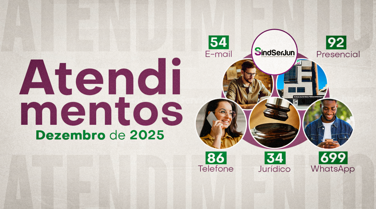 O SINDSERJUN fechou dezembro com 965 atendimentos aos Servidores – um crescimento de 21,68% em relação ao mesmo período de 2024. Os números englobaram contatos por WhatsApp, e-mail, telefone, presencialmente na sede e visitas aos locais de trabalho. A soma TOTAL do ano de 2025 (administrativo – 12.826, e jurídico – 1.312) é de 14.138 atendimentos realizados em 2025. Esses números refletem o compromisso contínuo da entidade em atender às demandas da classe trabalhadora com dedicação.