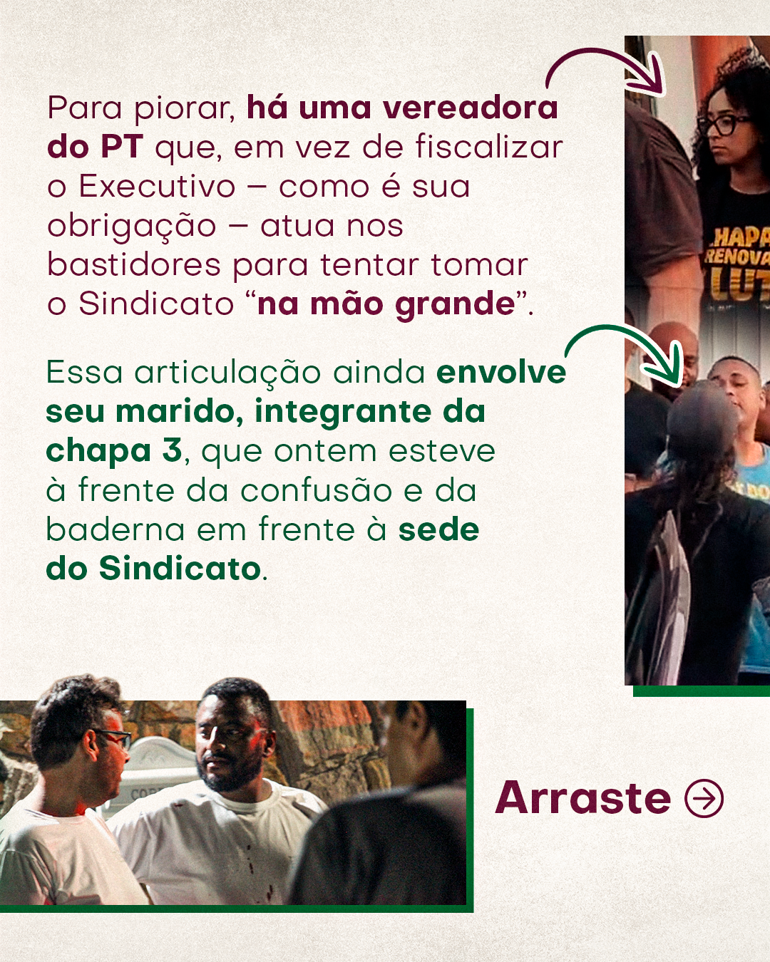Querem usar o SINDSERJUN como trampolim político, desviando o foco daquilo que é essencial: a defesa dos direitos dos Servidores Públicos de Jundiaí. Para piorar, há uma vereadora do PT que, em vez de fiscalizar o Executivo – como é sua obrigação – atua nos bastidores para tentar tomar o Sindicato “na mão grande”. Essa articulação ainda envolve seu marido, integrante da chapa 3, que ontem esteve à frente da confusão e da baderna em frente à sede do Sindicato.