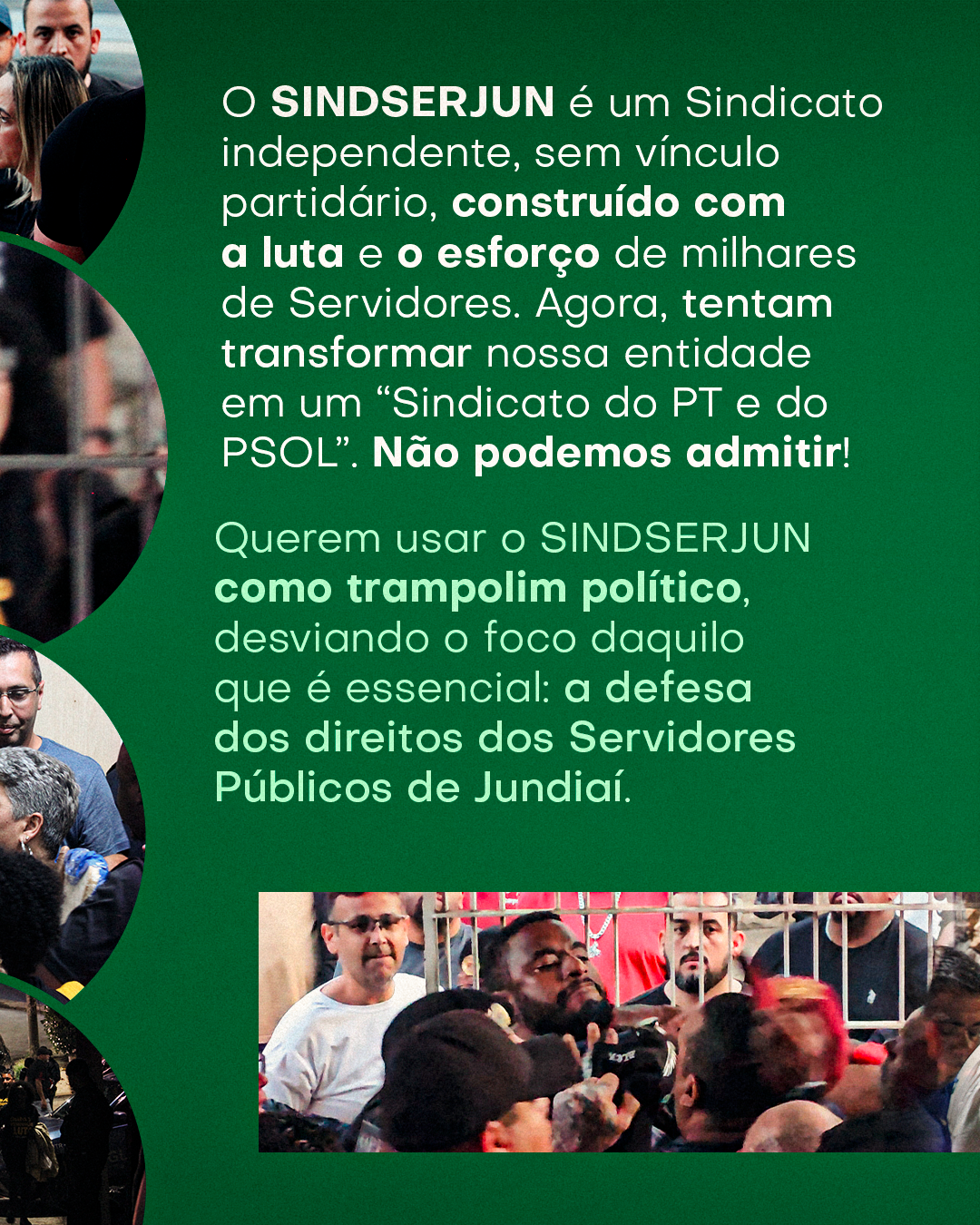 O SINDSERJUN é um Sindicato independente, sem vínculo partidário, construído com a luta e o esforço de milhares de Servidores. Agora, tentam transformar nossa entidade em um “Sindicato do PT e do PSOL”. Não podemos admitir!