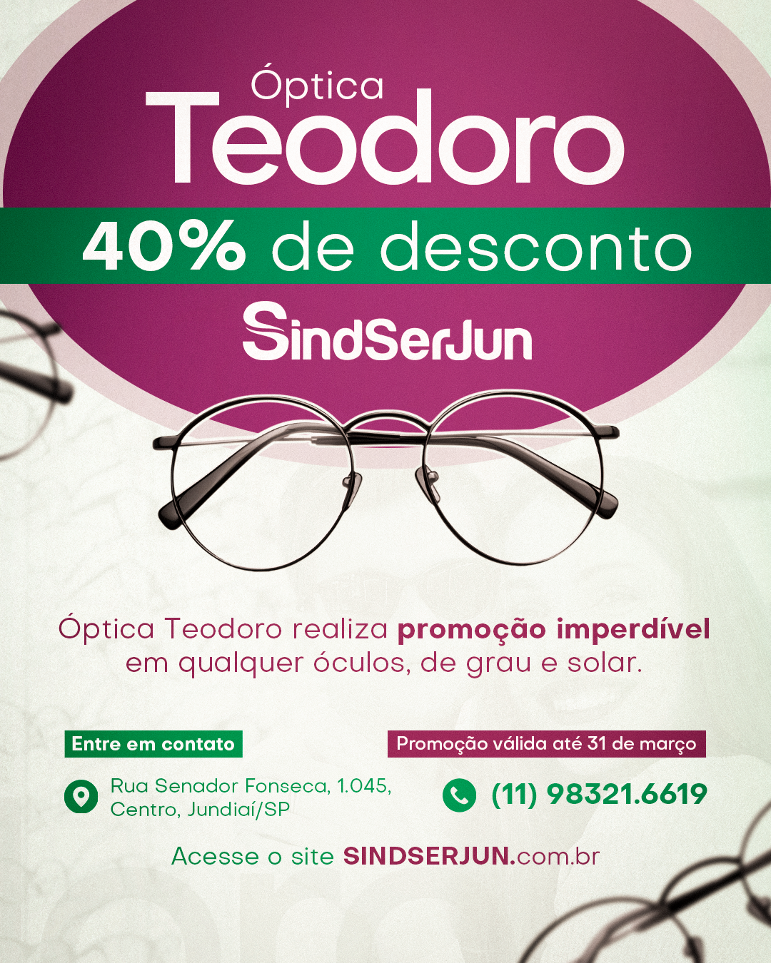 Em parceria com o SINDSERJUN, a Óptica Teodoro realiza uma promoção imperdível. Qualquer óculos, de grau ou solar, está com 40% de desconto. A condição é válida para pagamento no débito ou PIX até o dia 31 de março. O cuidado que seus olhos merecem com o preço que você procura!