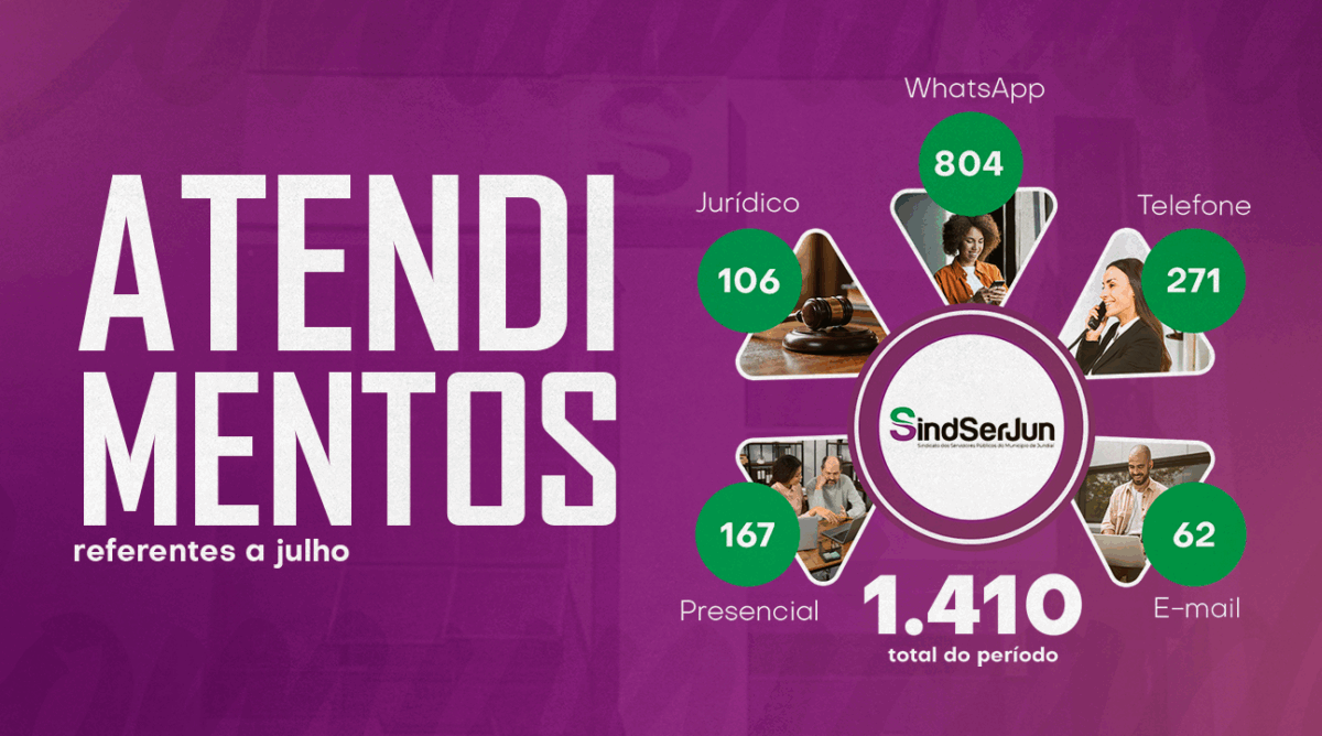 Temos esse compromisso como forma de transparência em relação a todos os trabalhos e ações realizadas em prol dos Servidores de Jundiaí. Em julho, foram realizados 167 atendimentos presenciais, 271 por telefone, 62 por e-mail, 804 via WhatsApp e 106 assessoramentos pelo nosso Departamento Jurídico, totalizamos 1.410 Servidores atendidos. Como sempre, nos colocamos à disposição dos companheiros para auxiliá-los nas mais diversas demandas.