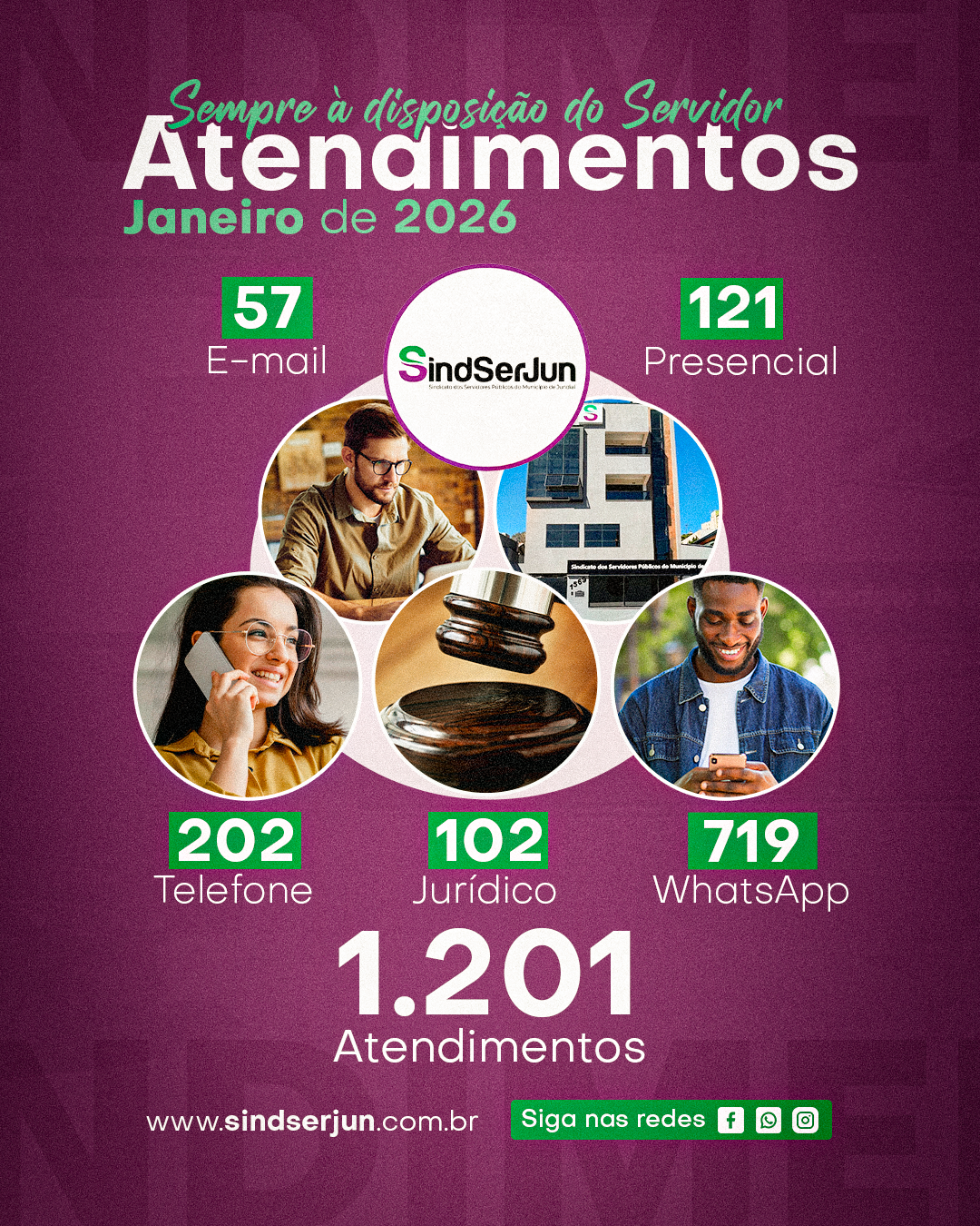O SINDSERJUN inicia 2026 com mais de 1.200 atendimentos realizados aos Servidores no mês de janeiro – um crescimento de 1,52% em relação ao mesmo período de 2025. Os números englobaram contatos por WhatsApp, e-mail, telefone, presencialmente na sede e visitas aos locais de trabalho.