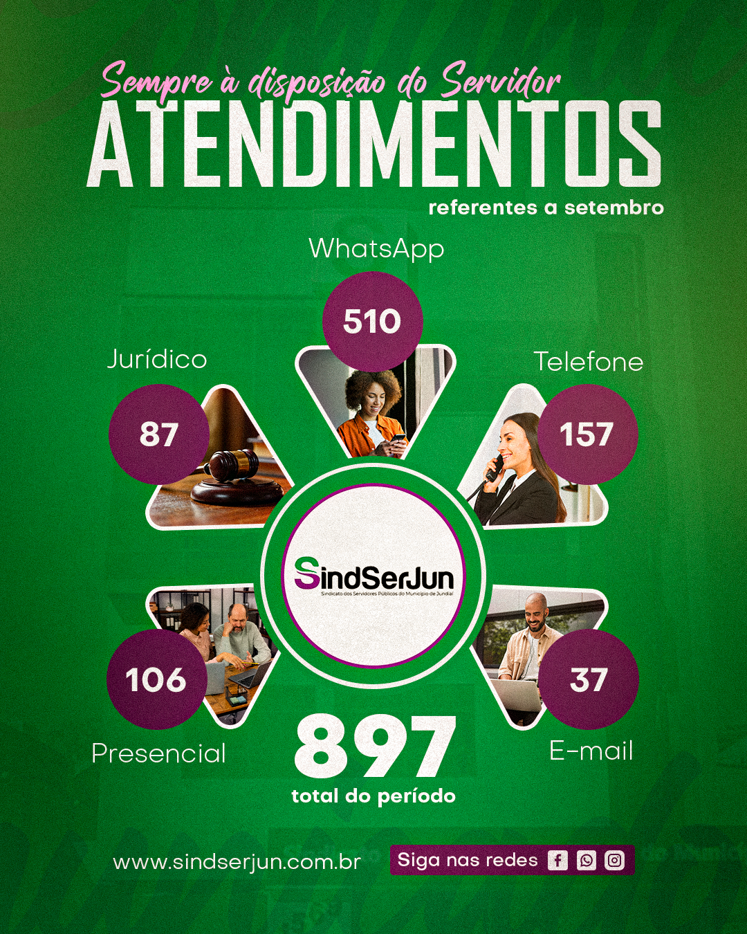 O SINDSERJUN segue com sua prestação de contas quanto aos serviços e atendimentos prestados aos Servidores de Jundiaí. No mês de setembro tivemos um total de 897 atendimentos, sendo: 510 pelo WhatsApp, 37 por e-mail, 157 via telefone e 106 presencialmente. A equipe do Sindicato está sempre pronta para receber você e oferecer todo o suporte necessário. Estamos aqui para ajudá-los, companheiros!