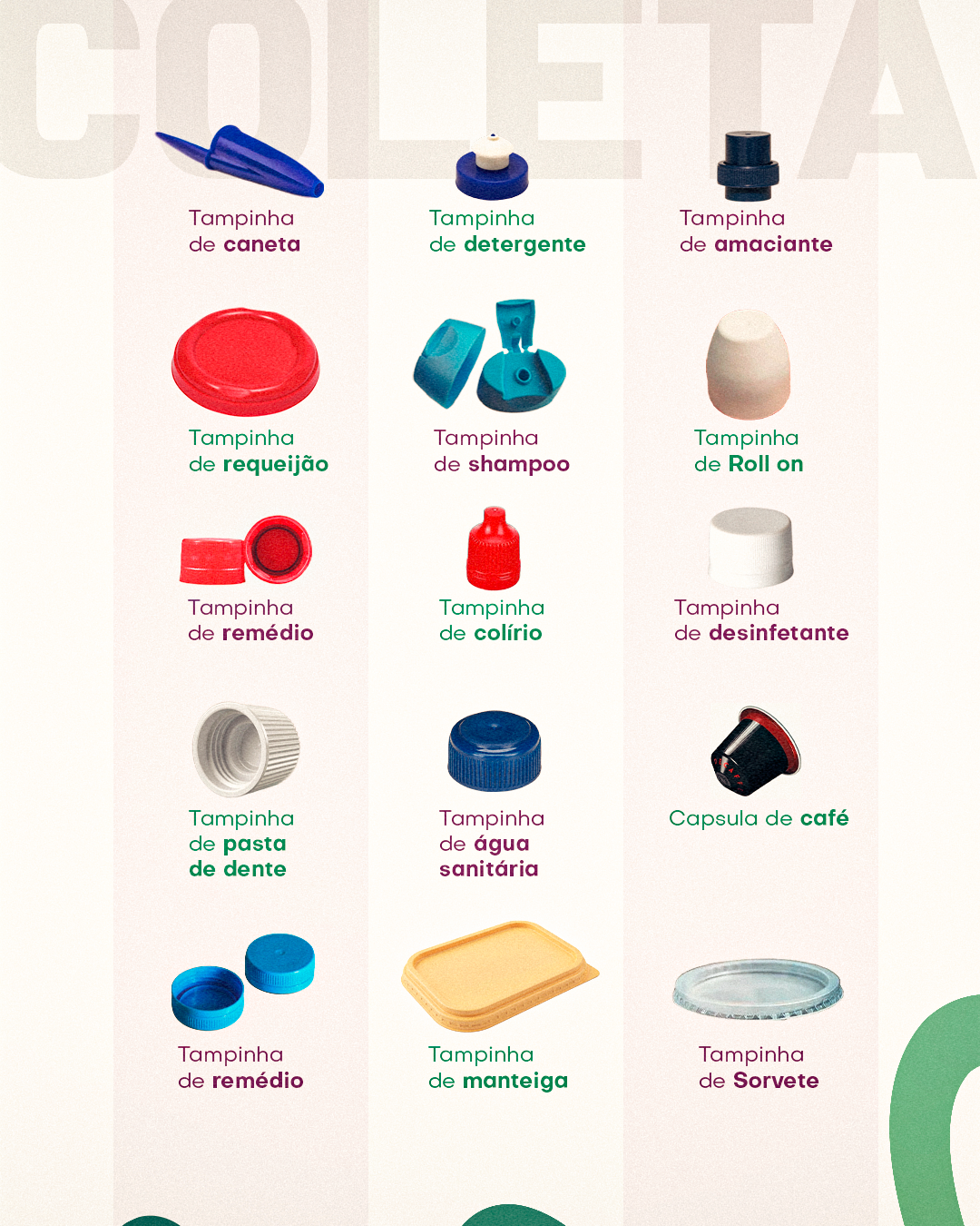 Os Servidores ou a população em geral de Jundiaí podem doar as seguintes tampinhas: tampinha de caneta, detergente, amaciante, requeijão, shampoo, roll-on, remédio, colírio, desinfetante, pasta de dente, água sanitária, cápsula de café, manteiga, sorvete, achocolatado, sabão líquido e lacres.