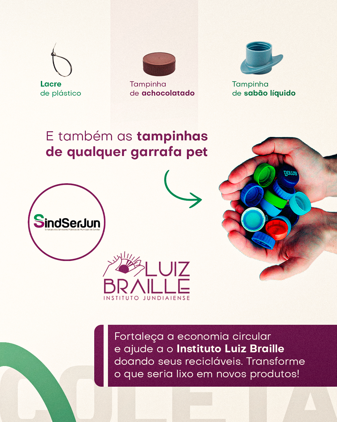 O SINDSERJUN, mais uma vez, incentiva os Servidores associados a participarem deste maravilhoso projeto de doação e transformação, por meio do trabalho realizado pelo Instituto Luiz Braille, na habilitação e reabilitação de pessoas com deficiência visual ou baixa visão. Porém, para fortalecermos o trabalho do Instituto, o Sindicato compartilha quais tampinhas podem ser doadas, a fim de fortalecer a entidade.